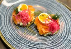 330 г • Чиабатта, сырный мусс с печеным перцем, домашний лосось, огурчики по-тайски, креветки, манго, чука, ростбиф из говядины, вяленые томаты